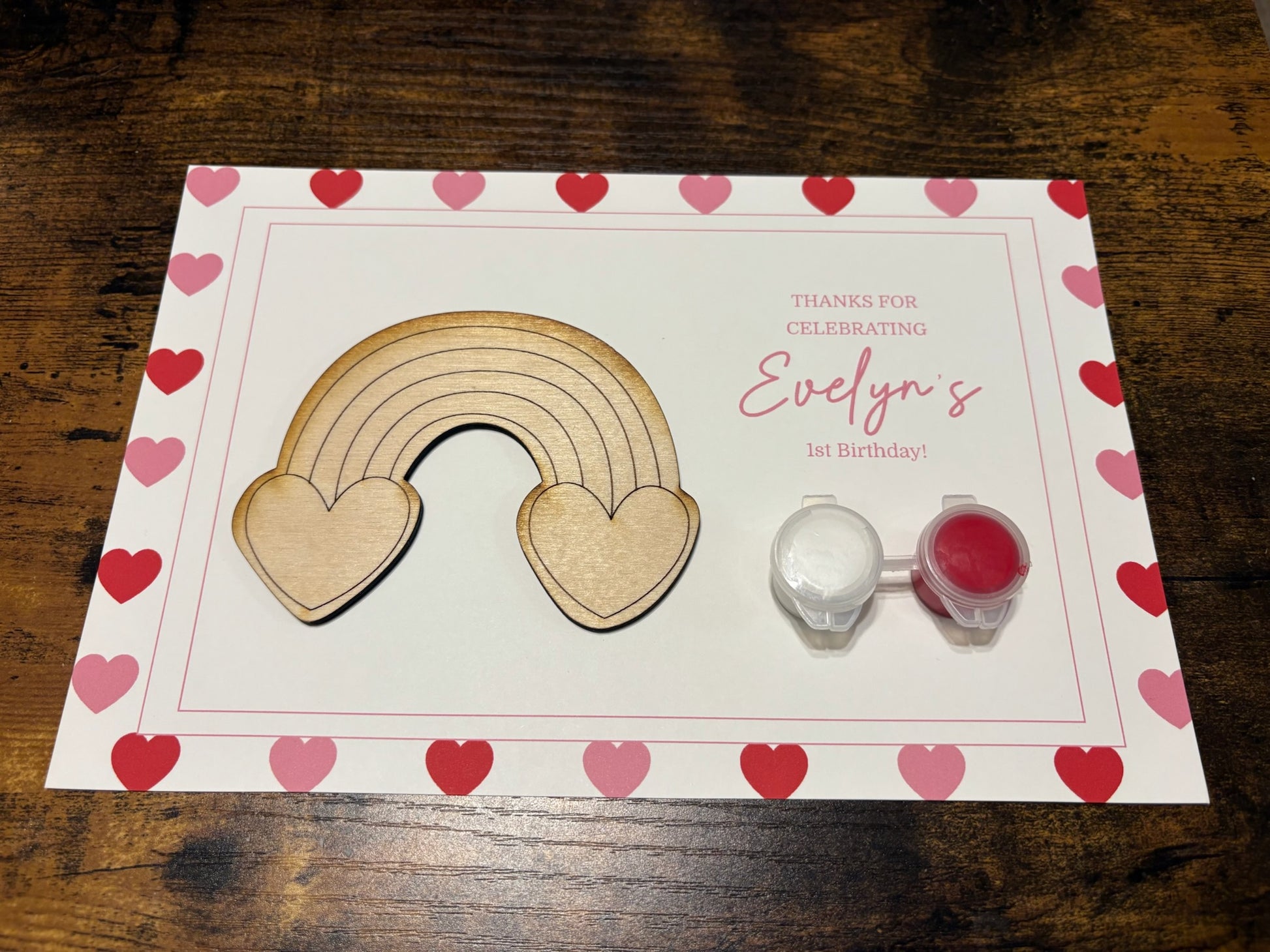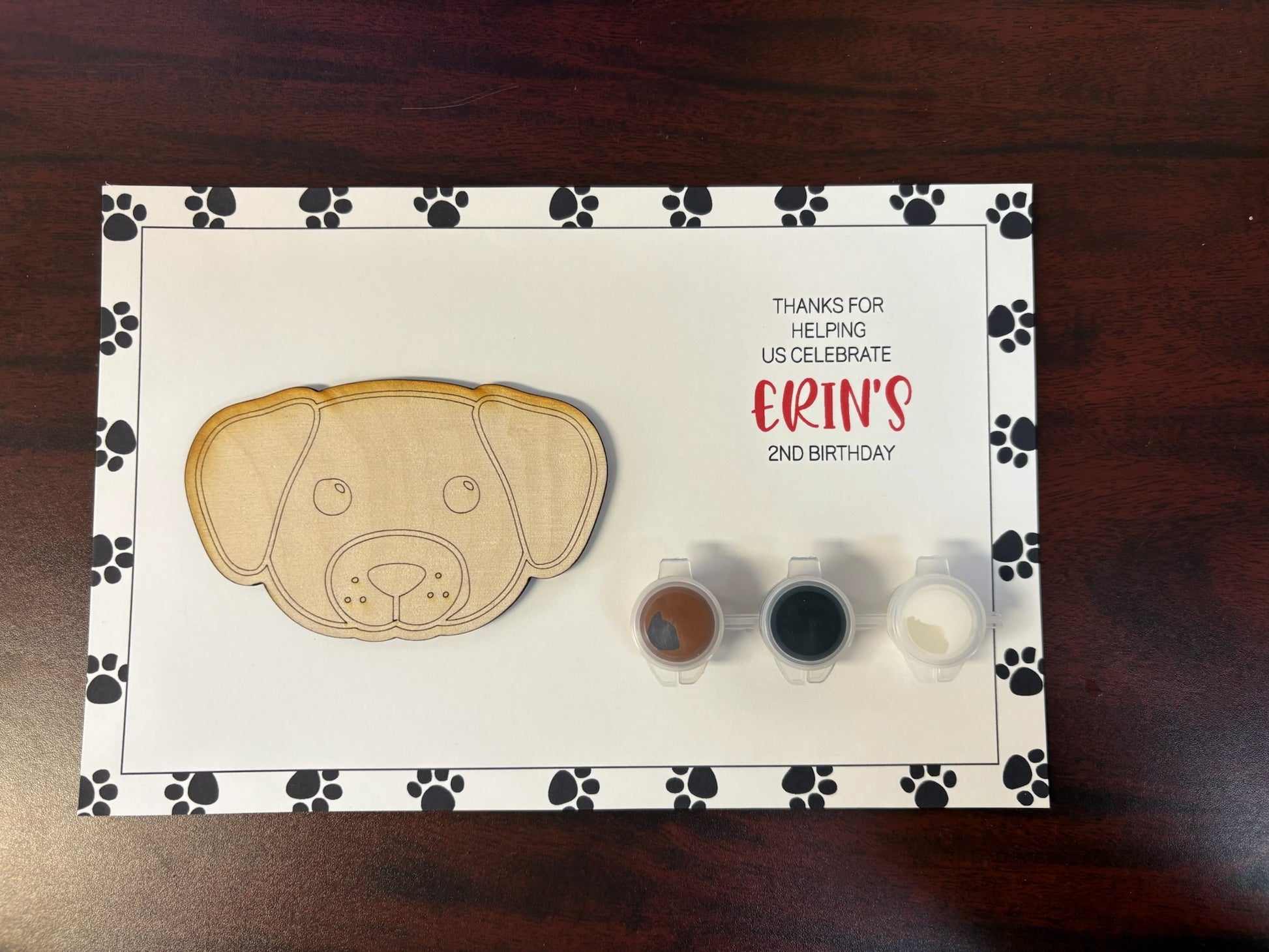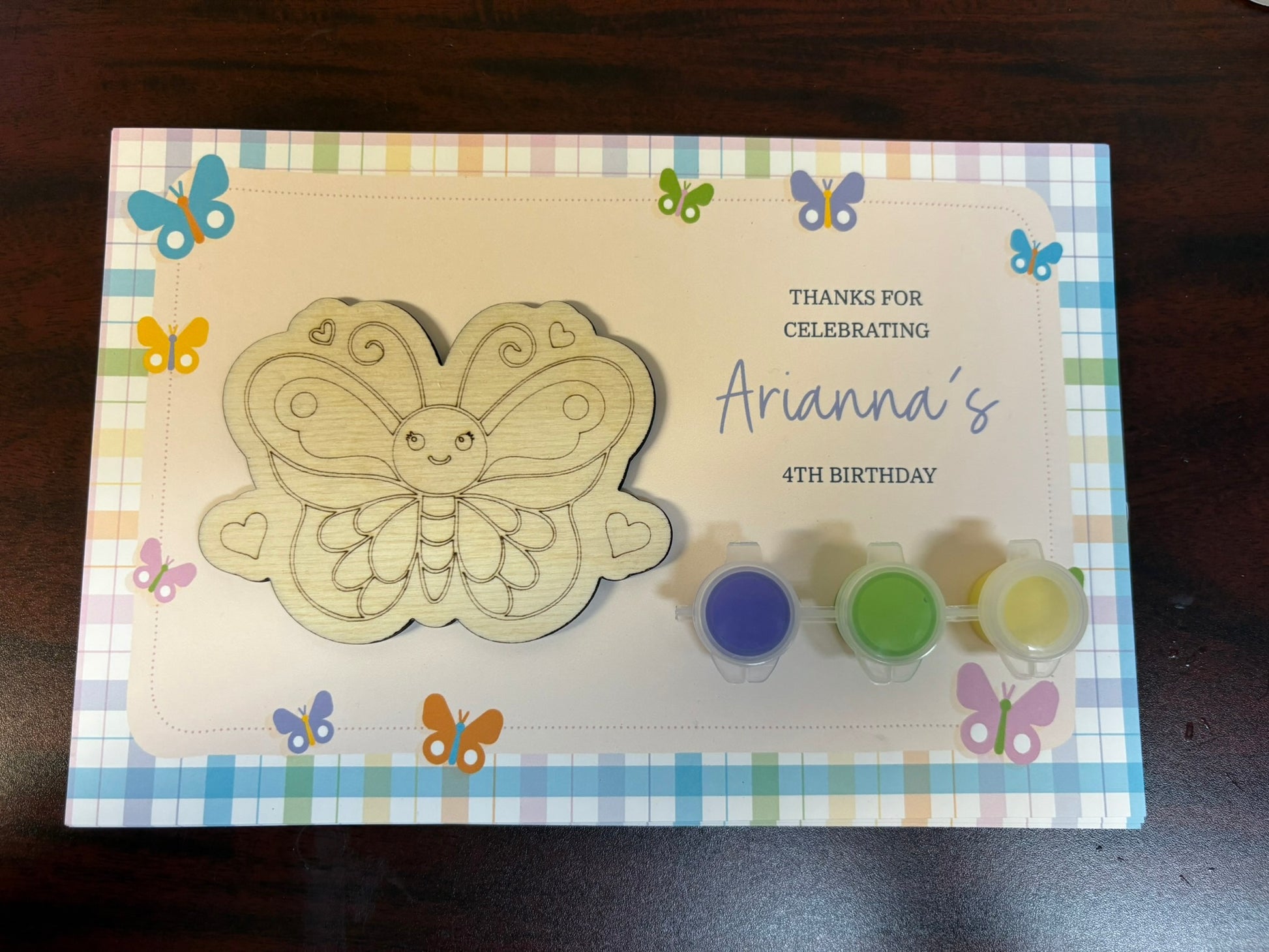 The painters are placed in a plastic bag, with the birthday boy/girl name and age on a backer, and a 3-5 inch wood painter (depending on design) and three paints.