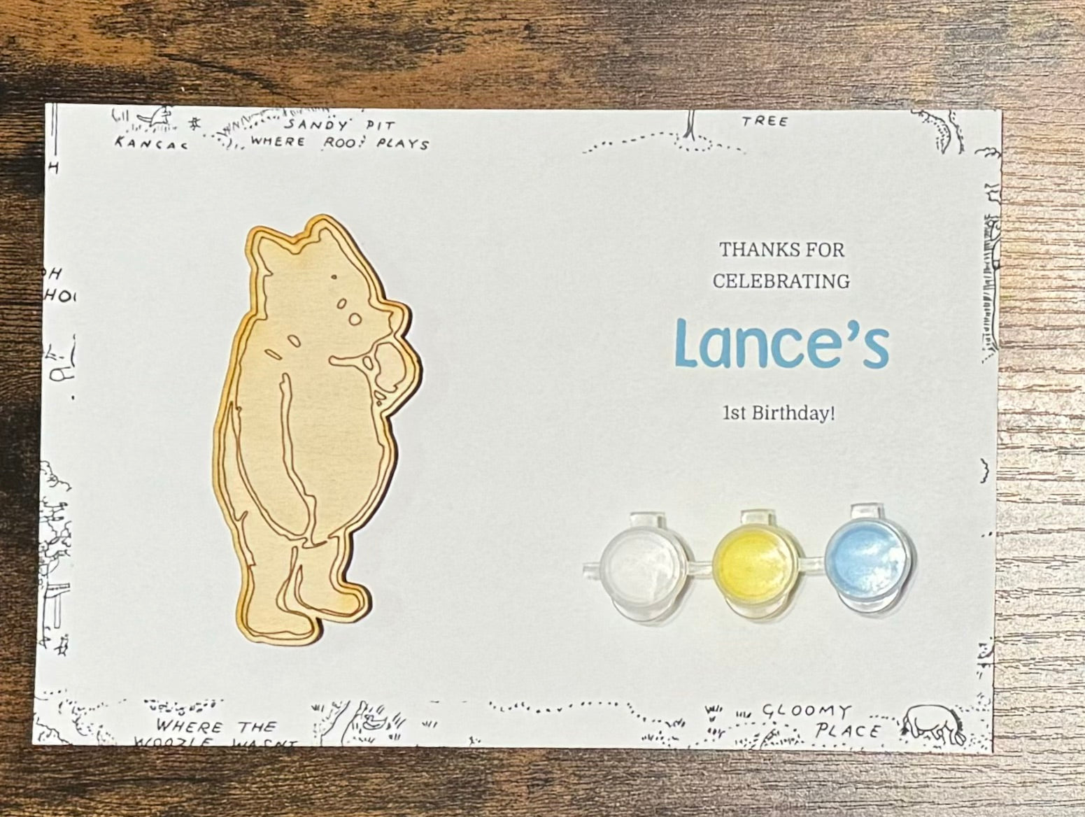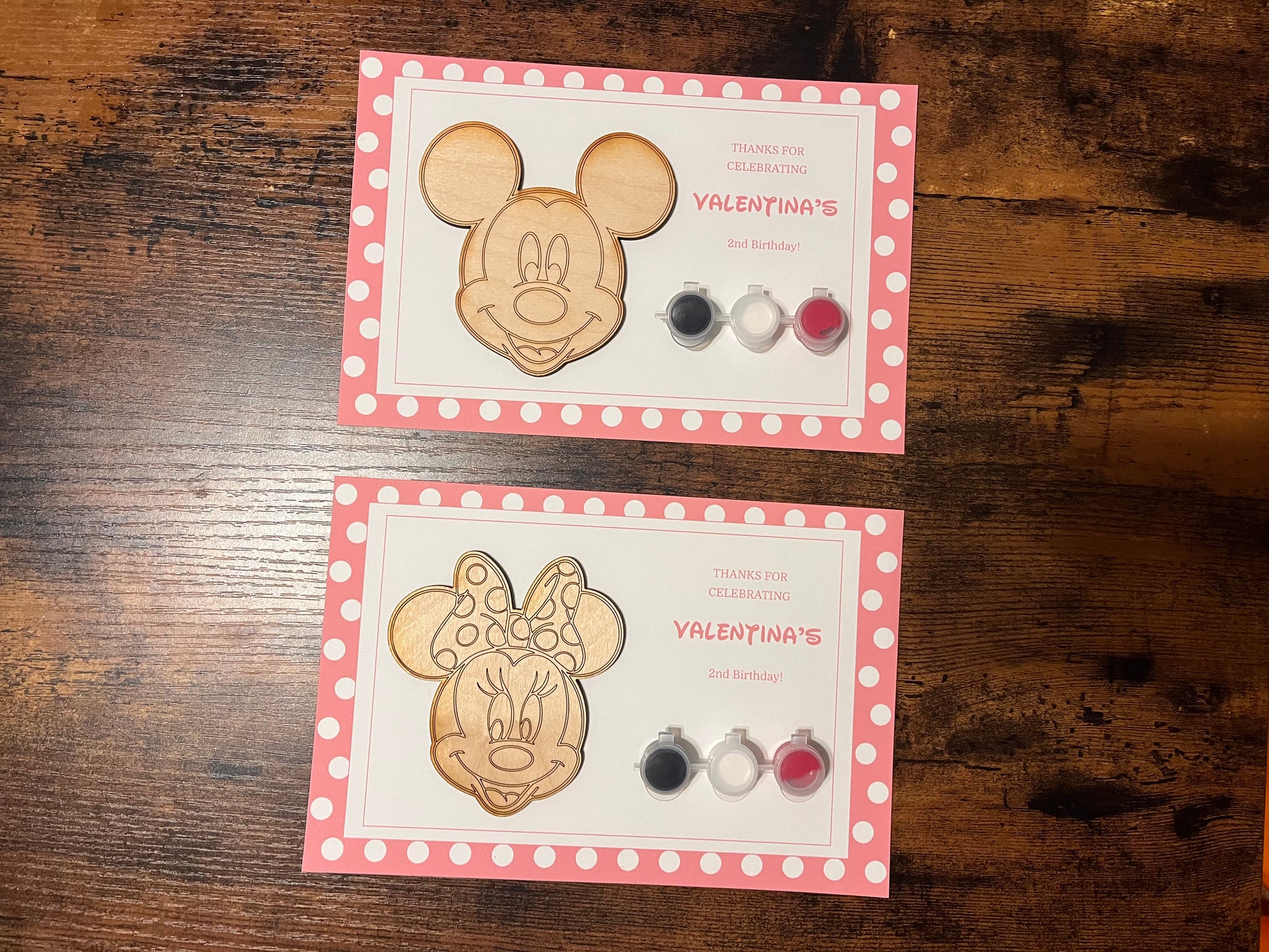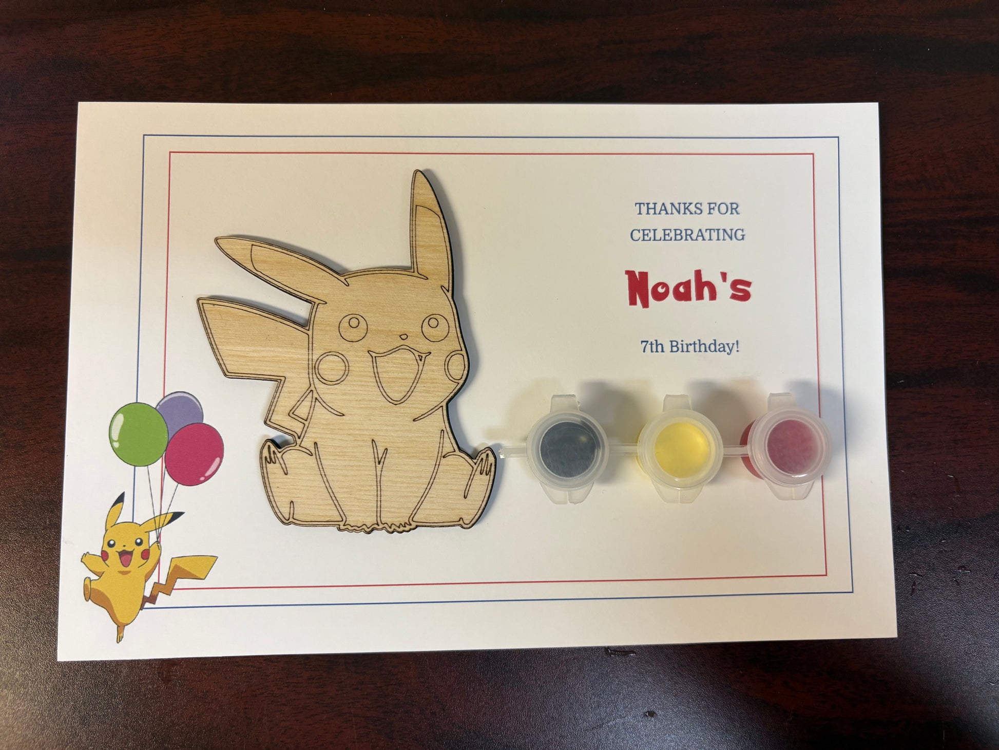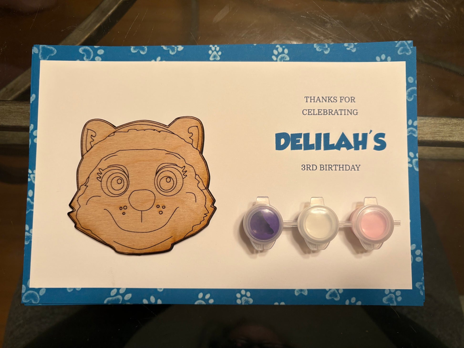 The painters are placed in a plastic bag, with the birthday boy/girl name and age on a backer, and a 3-5 inch wood painter (depending on design) and three paints.